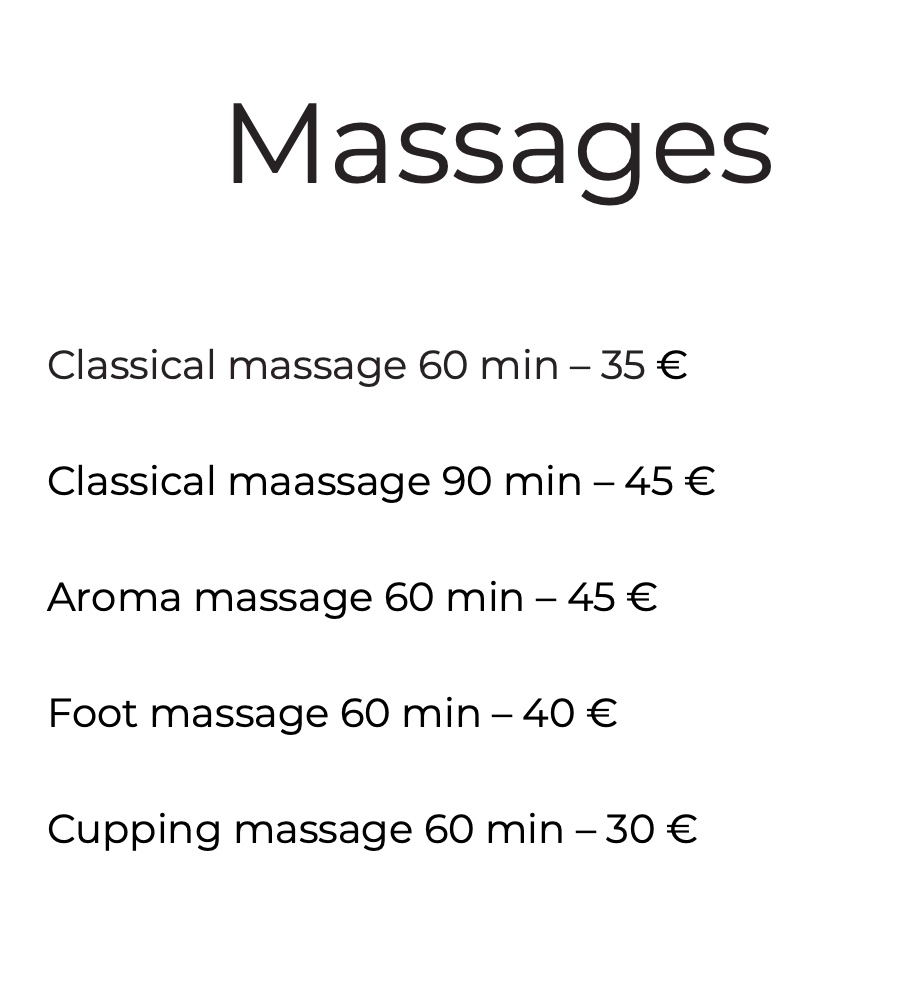 - В массажном автобусе ELAN (время можно забронировать по тел. +372 563 59313, стоимость массажа 50 мин – 35 €, 25 мин – 20 €, оплата на месте наличными), а также в массажном кабинете Лепанина. (заранее забронировать время можно по тел. +372 44 37 368 или по адресу lepanina@lepanina.ee)