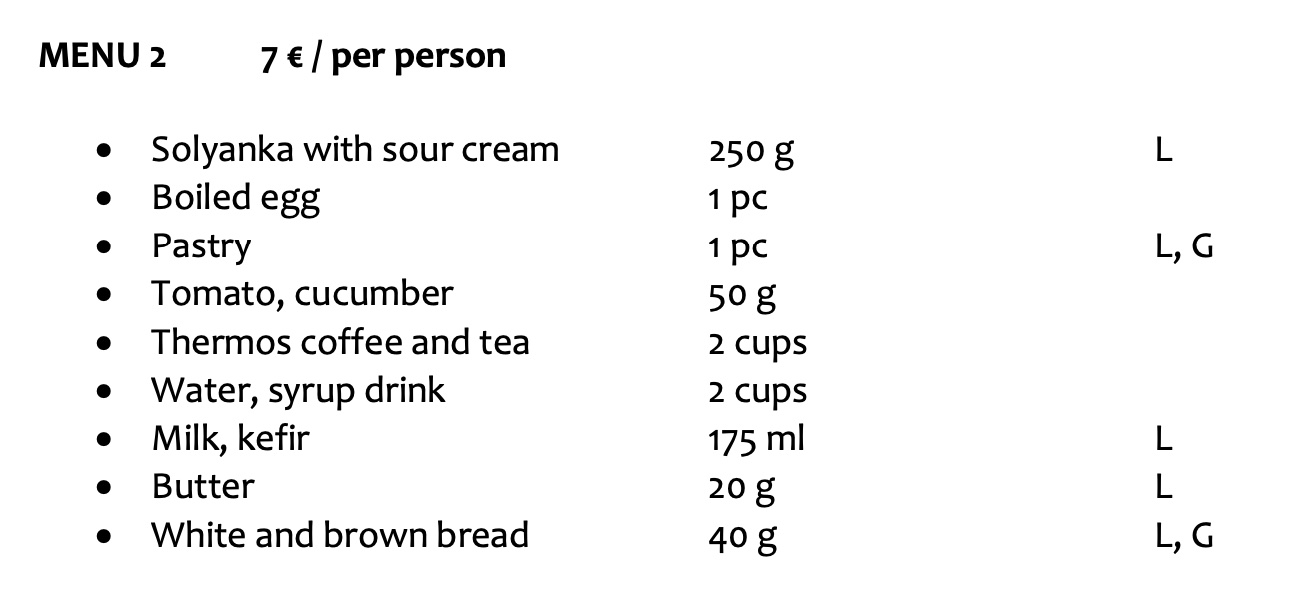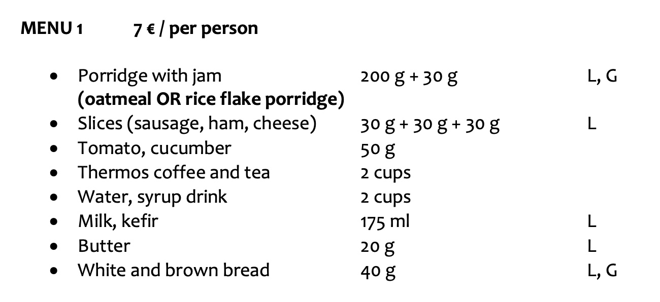 • perjantain ja lauantain aamiainen 7 €/henkilö/ruokalista nro 1