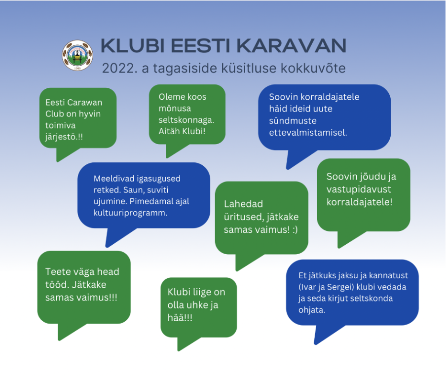 Klubi Eesti Karavan areneb tänu külastajate tagasisidele, mistõttu korraldasime 2022. a detsembris küsitluse, mille eesmärk oli saada tagasisidet toimunud ürituste kohta ja seeläbi paremini planeerida edasisi tegevusi. Küsitlusele vastas 223 inimest. Alljärgnevalt toome teieni kokkuvõtte tagasiside küsitluse tulemustest.